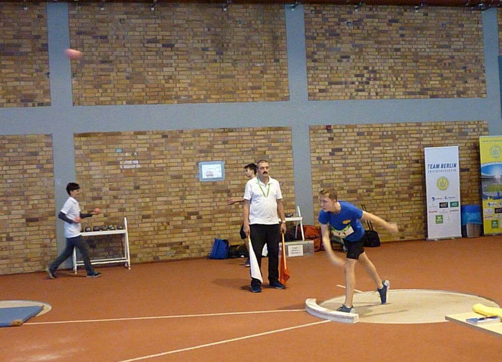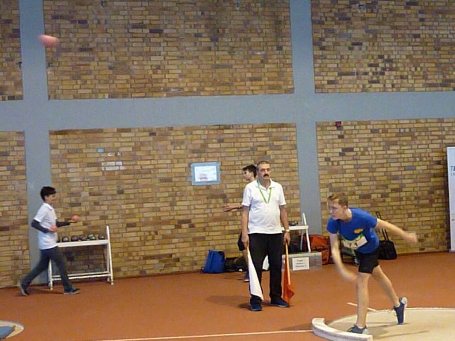 Julian und Bela hatten ein ähnliches, aber umfangreicheres Programm. 60m, Weitsprung und Kugelstoßen. Beide knacken ihre eigenen Rekorde über die 60m. Bela mit 8,15s im Vorlauf - Julian mit 7,82s im A-Finale, was gleichbedeutend mit Platz 2 ist. Im Weitsprung liegen am Ende beide auf den Plätzen 2 und 4... Julian mit 5,24m und Bela mit 5,07m, für Letzteren persönliche Bestmarke. Rekorde gab es für beide dann auch noch im Kugelstoßen und dazu noch auf kuriose und knappe Weise. Der bis zum 5. Durchgang führende Bela muss sich am Ende Julian um 1 Zentimeter geschlagen geben. 10,73m und 10,72m bedeuten dann auch die ersten beiden Plätze.