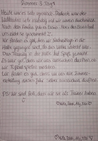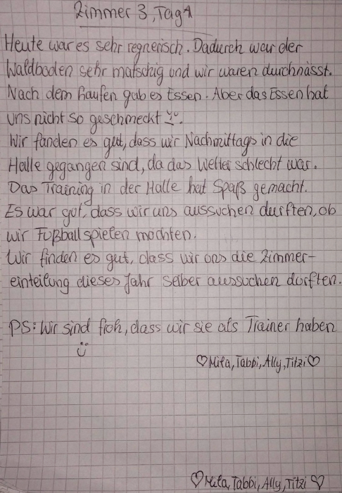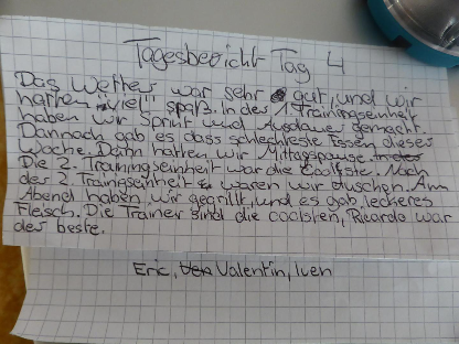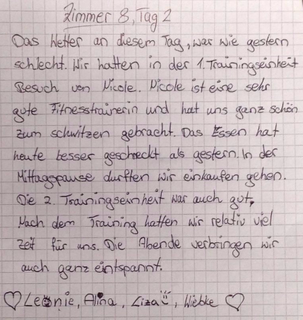 Eine tolle Idee vor Ort ist, dass die jeweiligen Zimmer zum jeweiligen Tag ein paar Zeilen zu Papier bringen. Hier können wir uns darüber freuen.